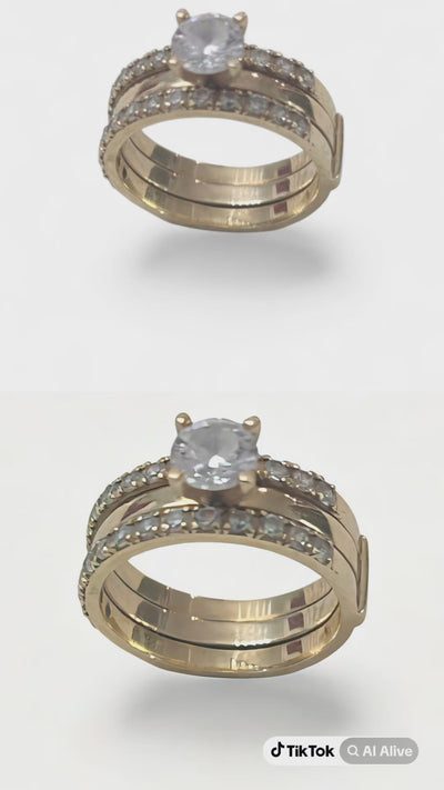 Este Anillo de compromiso doble aro es perfecto para una mujer moderna y elegante. Hecho de oro 14k, su belleza radica en sus tres aros entrelazados, manteniendo su comodidad para el uso diario y a la vez simbolizando la unión del matrimonio. ¡Haz que su día sea especial con este hermoso anillo!