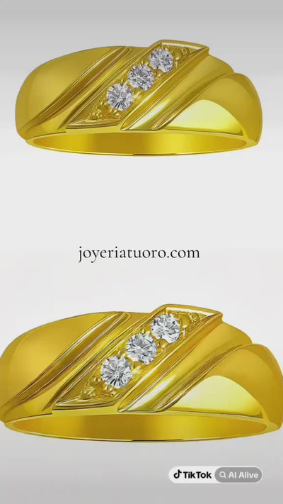 Anillo de compromiso tres piedras. Este modelo de anillos son hechos iguales el de hombre y mujer, solo varían el volumen del mismo para complacer diferentes gustos y preferencias, las tres piedras o seis son de circonitas cubicas, tienen una presencia elegante y atemporal, hechos a mano en oro 14k.