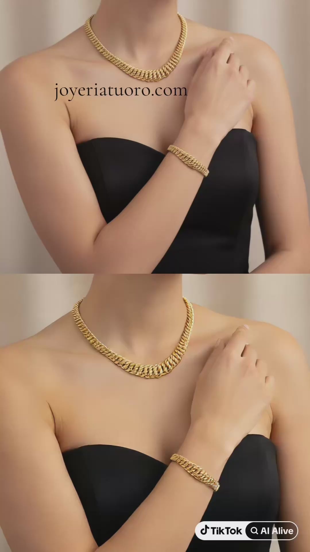 Fabricados en Oro amarillo 14K auténtico, la gargantilla y el pulso ofrecen resistencia y comodidad con un diseño atemporal. Cada pieza cuenta con un tranque de caja 🔒, reconocido por su seguridad y su estética refinada, lo que garantiza que disfrutes de tu conjunto con total confianza.